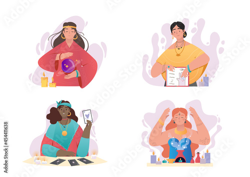 Female fortune teller using tarot cards to predict future online. Online spiritual seance and divination concept vector posters set. Tarot cards, magic objects and sign