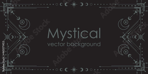 Vector mystical dark boho background with an ornate geometric frame including moon phases, crescents, stars and beams. Occult vertical banner with magical symbols. Cover for tarot cards