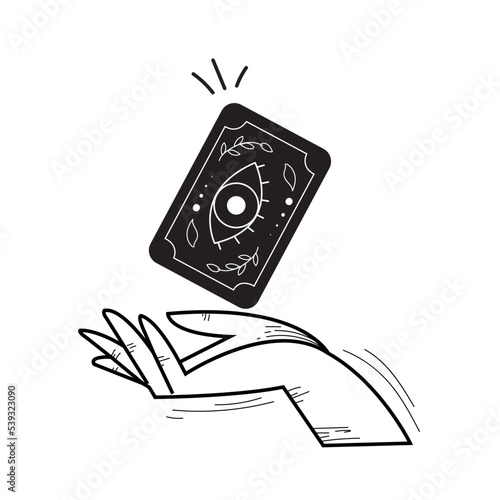 Set of boho hand drawn mystical magic set. Esoteric doodle elements and logo icons with hands, raven dagger. Black outline style. Abstract vector illustration