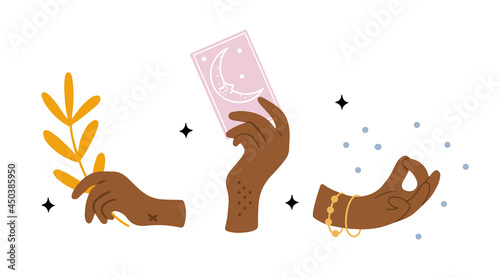 The witch lays out tarot cards. Two female hands and a mystical deck of cards with the moon and sun. Magic hand drawing, vector isolated on white background.