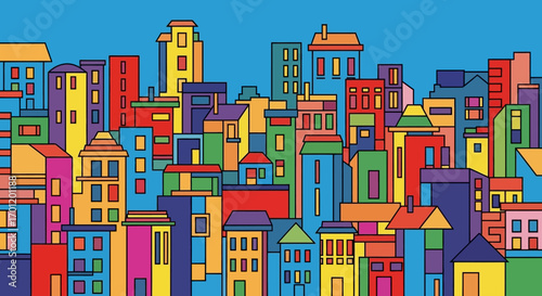 Colorful urban cityscape illustration depicting diverse buildings and architecture.