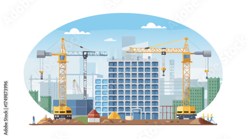 Evolution of urban architecture: cityscape with skyscraper construction and crane