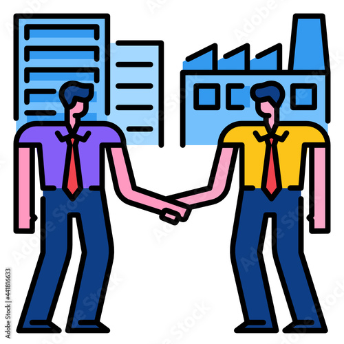 Memphis business illustration. B2B -modern flat vector concept illustration of handshaking partners, industrial buildings and chart with managers. Corporate business partnership metaphor.
