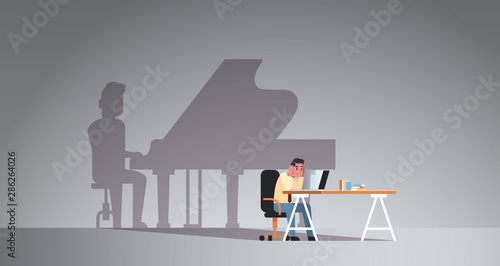 overworked man sitting at workplace using laptop shadow of man playing piano imagination aspiration concept male cartoon character flat horizontal full length vector illustration