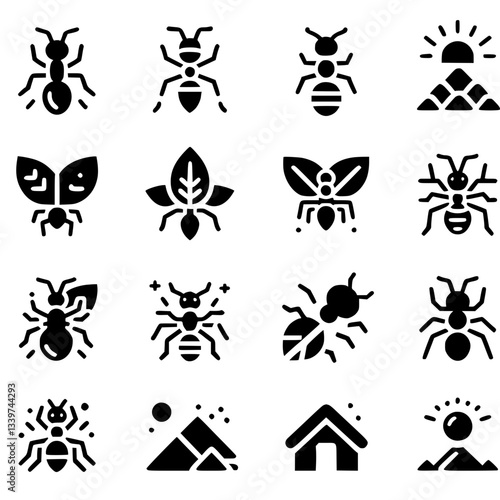 Illustration of various black ants in different poses and styles showcasing their characteristics..