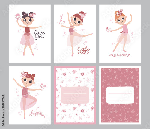 Little Girl Ballerina in Tutu Skirt and Pointe Shoes Dancing Ballet Vector Set
