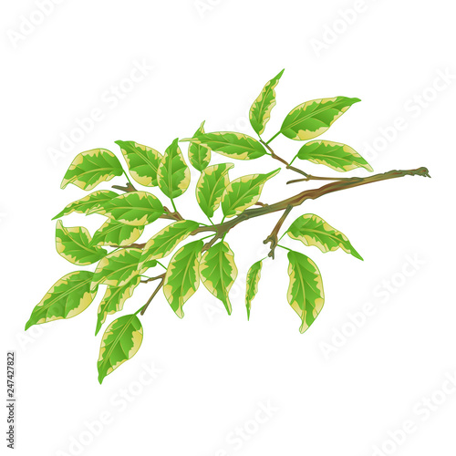 Tropical plant Ficus benjamina Variegated Ficus  branch on a white background vintage vector illustration  editable hand draw
