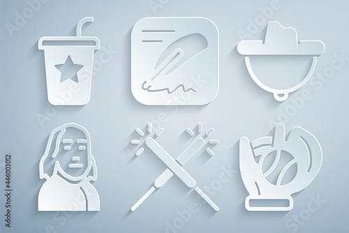 Set Sparkler firework, Western cowboy hat, Benjamin Franklin, Baseball glove with ball, Declaration of independence and Paper glass straw icon. Vector