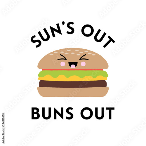 Vector illustration of a cute hamburger with a kawaii face. Sun's out buns out. Funny food concept.
