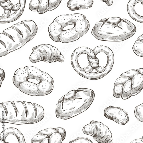 Loaf of sweet bread, pretzels and buns seamless pattern