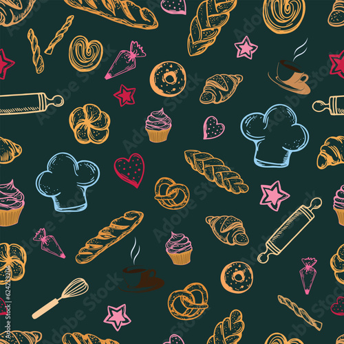 Seamless pattern with bread and pastries.