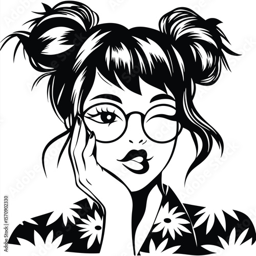 Monochrome girl with flower shirt and hair buns winks playfully with glasses on