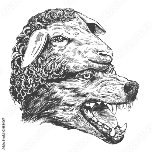 Wolf in sheep s clothing, Christian parable, hand drawn vector illustration realistic sketch