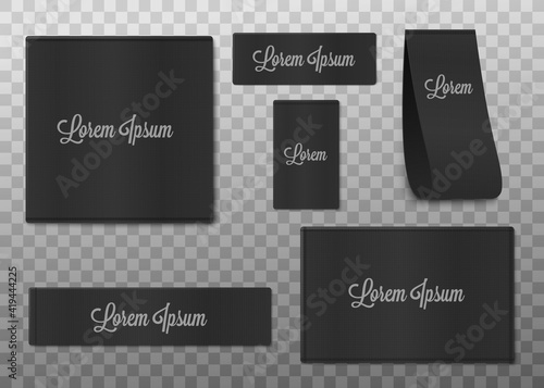 Black blank fabric clothing labels set, realistic vector illustration isolated.