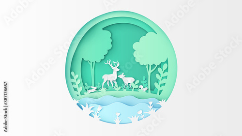 Paper layer cut of top view environment in spring forest with flower, trees, river, and narrow valley. Spring valley. paper cut and craft style. vector, illustration.