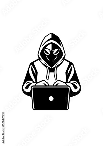 Hacker icon. Bold Graphic Hooded Hacker Figure with Laptop in Logo-Style Design