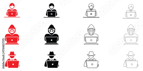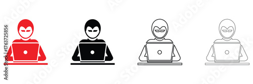 anonymous hacker icon, hooded figure using a laptop, cybercrime, hacking, and online security threats symbol vector illustration