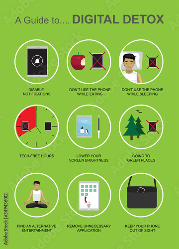Dopamine fasting guide. Illustrating stress relief, mental peace, digital detox, and fast food refusal. Enhance life quality. Flat vector illustration.