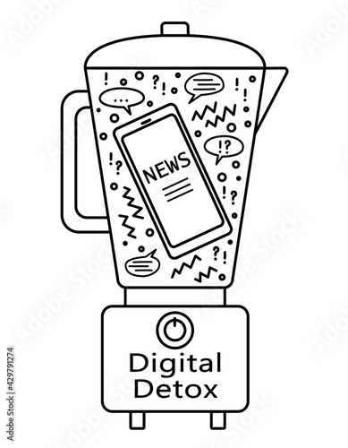 Blender with a mobile phone inside. Digital detox, concept vector illustration. An idea of gadget disconnecting, healthy lifestyle, escape from internet and digital media addiction.  Isolated on white