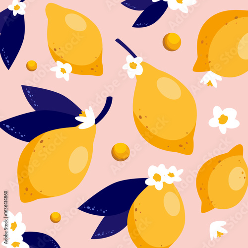 Vector cartoon set with fresh lemon fruits whole, half, slices, lemon cedar, blooming flowers, leaves, lemon squeezer isolated on white background.