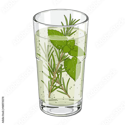 Isolated glass jar of sweet detox cocktail. Delicious refreshing lemonade with lemon slices, green mint leaves, and striped straw. Flat hand drawn vector design for menu.
