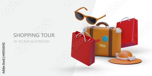 Trip for branded clothes. Things from famous designers. Booking tickets for fashion shows. 3D illustration for landing page of tour operator. Packages, paper bags, suitcase