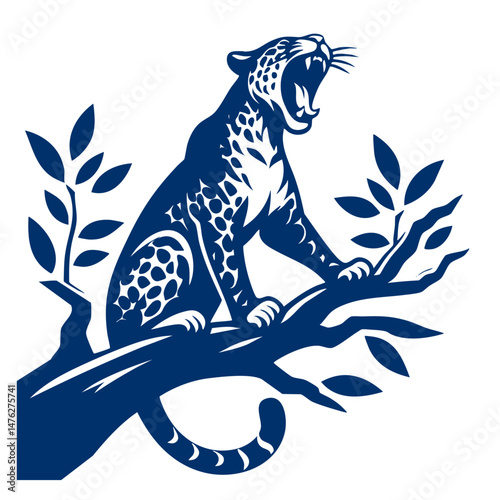 Roaring leopard in detailed linear style, icon set vector.
