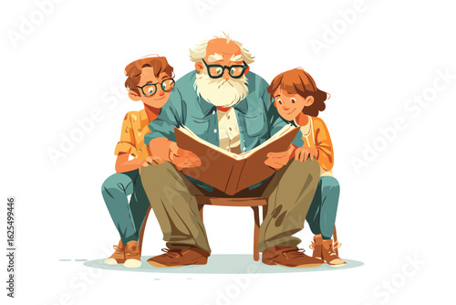 Grandfather read book to granddaughter and grandson. Grandpa with grandkids is sitting in sofa and tell story. Elder read grandchildren fairy tale. Senior with boy and girl stay home and spend time