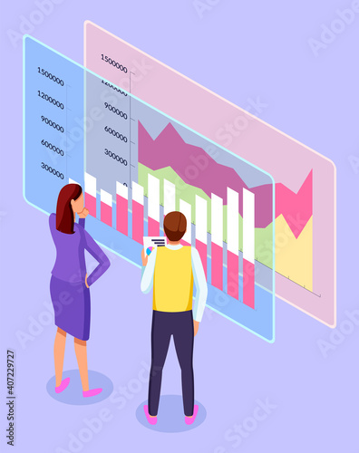 Group of people looks at a screen with graphs. Dashboard Business Landing Page. Cartoon Flat style vector illustration