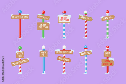 Set Christmas wooden signboard, road signs on striped stick with decoration, empty frame in cartoon style isolated on white background. Holiday decoration. Ui game asset.