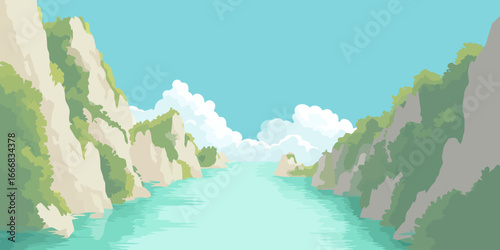 Breathtaking low angle vector illustration of a majestic canyon reaching towards a blue sky