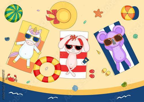 Hand drawn vector illustration of a cute unicorn, bunny and koala in sunglasses on the beach, lying on striped towels, with swimming ring and watermelon