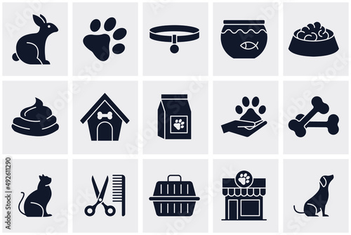Pet Shop isolated icon set. Set of cat and dog, cat litter box, dog muzzle, leash collar, canned food, pet carrier, vet, pet grooming clippers, animal vaccination certificate, birdhouse vector icons