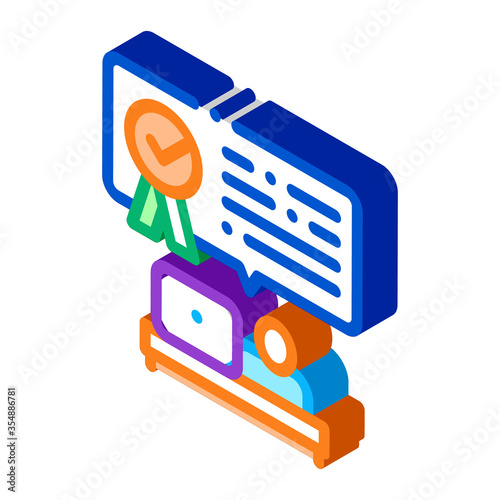 Employee Strives For Victory Icon Vector. Isometric Employee Workplace With Laptop, Quote Frame Medal And Text sign. color isolated symbol illustration