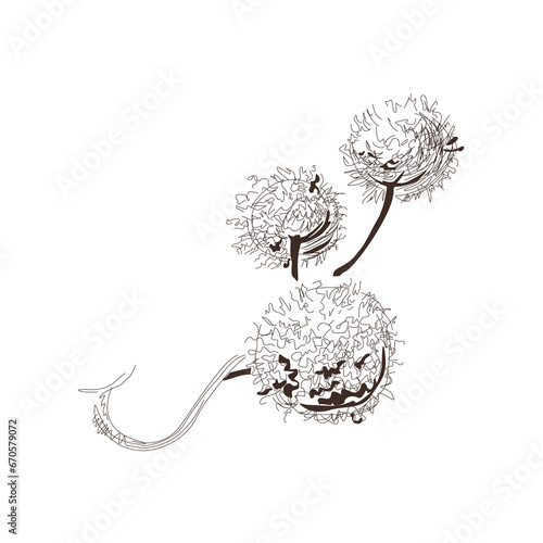 Sketching drawing of a western sycamore. Autumn fruits on a branch. Botanical drawing. Sycamore tree. Decorative spherical fruits of plane tree.
