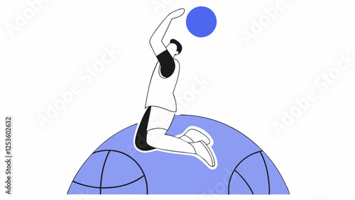A stylized image of a basketball player jumping with a ball ready to shoot, atop a blue, spherical surface resembling a basketball. The minimalist design uses a monochromatic palette.AI