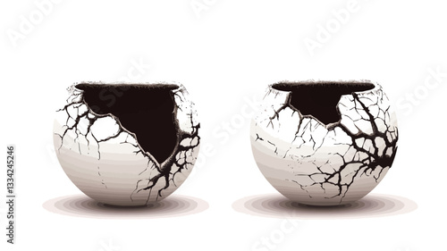 Close-up studio shot of two spherical ceramic vessels.  Both vessels are predominantly white with a black interior visible through large cracks that spiderweb across their surfaces. The cracks are