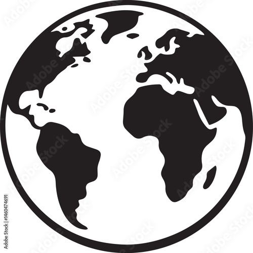 black and white globe, simplified world map, Earth illustration, minimalist design, high contrast, vector graphic style, spherical planet, continents silhouette, global icon, cartographic representati