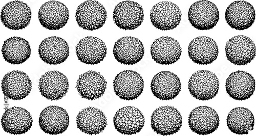 A monochrome, detailed stipple illustration of numerous spherical tree tops with varying leaf patterns, densely packed together.