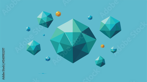 Geometric shapes abstract illustration with polygonal and spherical elements on teal background