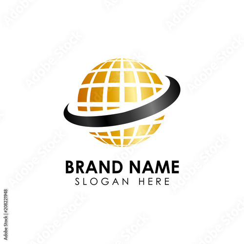 golden Stylized 3D spherical surface with  swoosh shape. digital globe icon. This logo is suitable for global company, world technologies and media and publicity agencies