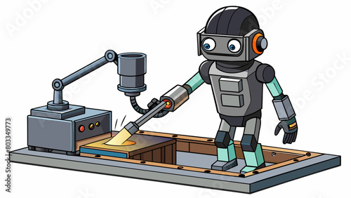 A sleek black and silver robot with a long slim body and a spherical head performing soldering and welding tasks in a manufacturing plant. Its. Cartoon Vector
