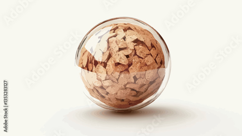 Close-up studio shot of a spherical object composed of compressed cork pieces encased within a clear, transparent glass or plastic orb. The cork pieces exhibit a varied light brown and beige color