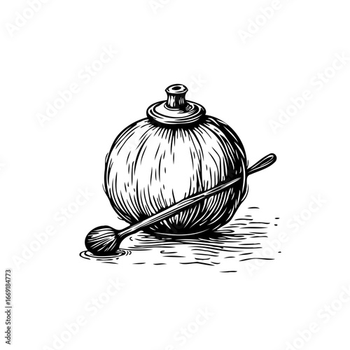 Vintage spherical perfume bottle with ornate applicator, rendered in a delicate, stylized etching