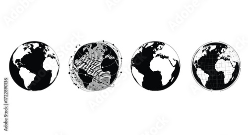 Four earth globes with varying detail levels showing continents and oceans in a row vector