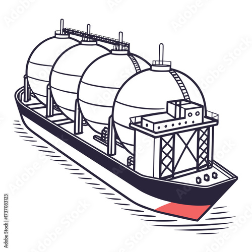 Stylized line drawing illustration of a large cargo ship carrying spherical tanks across the ocean