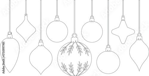 Elegant Black and White Line Art of Hanging Christmas Ornaments with Various Shapes and Designs