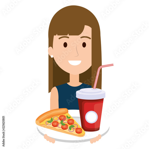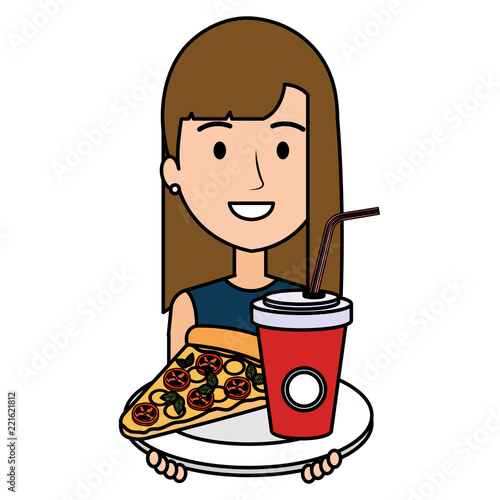 woman with italian pizza and soda