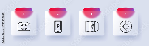 Travel set icon. Camera, telephone, sovereign technology, maps, geolocation, location, lifebuoy, search, magnifying glass, numbering, hobby, rest. Tourism and wandering concept. Glassmorphism style.