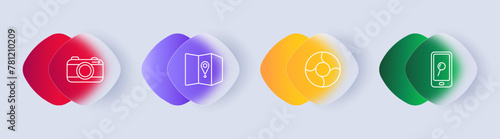 Travel set icon. Camera, telephone, sovereign technology, maps, geolocation, location, lifebuoy, search, magnifying glass, gradient, hobby, rest. Tourism and wandering concept. Glassmorphism style.